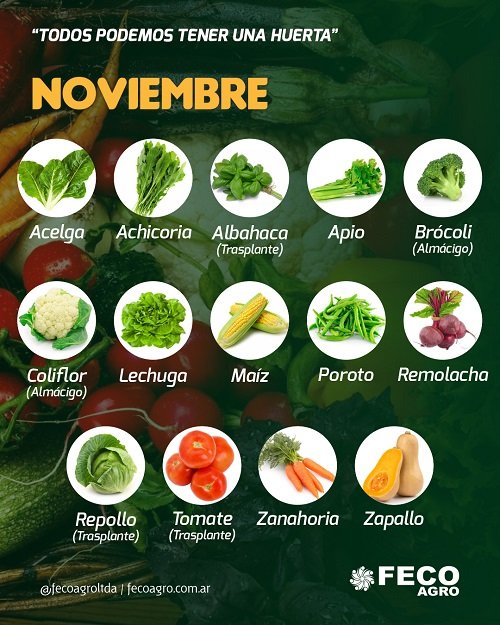 Durante el mes de noviembre podés plantar en tu huerta urbana acelga, lechuga, tomate, berenjena, zapallo, zapallito, pimiento, chaucha, apio, sandía, melón, papa. También maíz, para el que estamos en un momento clave.