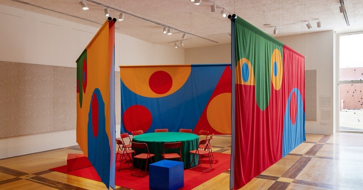 Construida en el centro de la sala dedicada a la abstracción, Club del collage especulativo se llama la instalación de Ad Minoliti especialmente creada para esta exposición. Inspirada en los clubes de lectura o espacios informales de reflexión, es transportable, de textura blanda y tiene eso de suave que asegura le está faltando al arte contemporáneo.