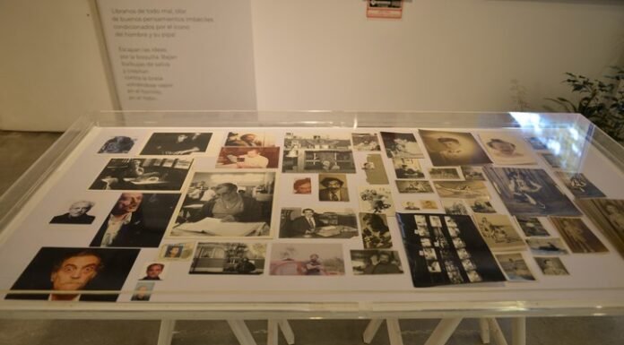 Un ejemplar de la primera edición de Los Pichy-cyegos (así era la grafía original), un panel con envoltorios de chicles Bazooka, manuscritos con anotaciones y dibujos, tapas de Ñ y notas de El Porteño, una sala que representa una pileta, fragmentos en video de sesiones de focus-group, un libro de poemas de Oscar Steimberg...